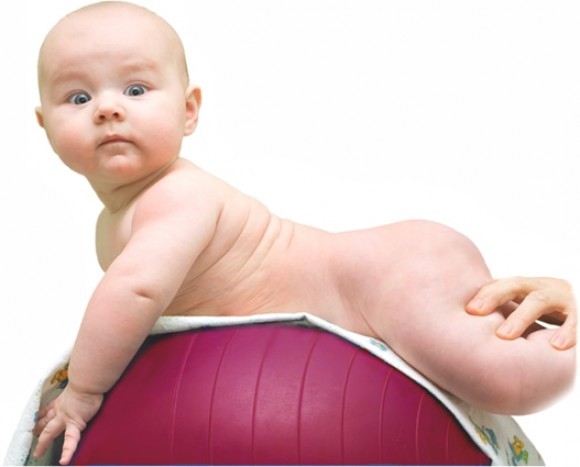 - Para fortalecer el tronco: Coloca al bebé boca abajo en una pelota grande (de Pilates o una pelota de playa hinchada) y la balancearemos a los lados.